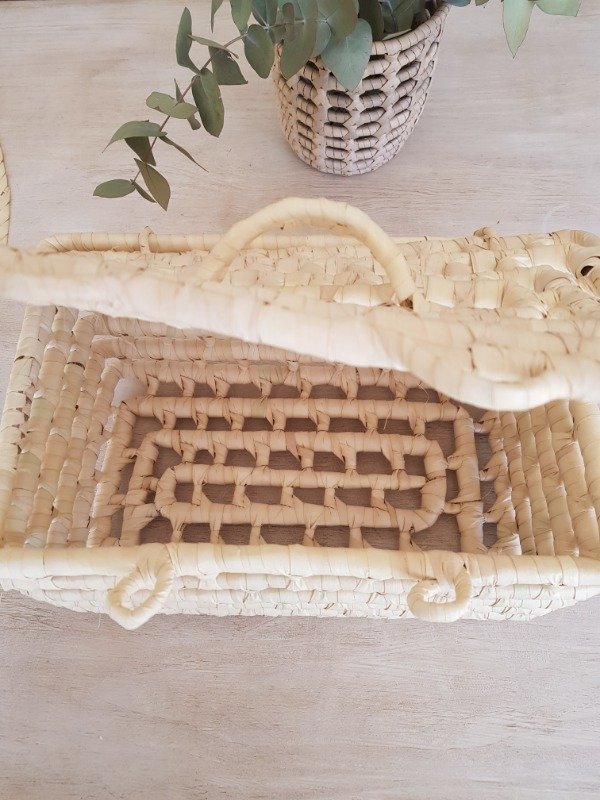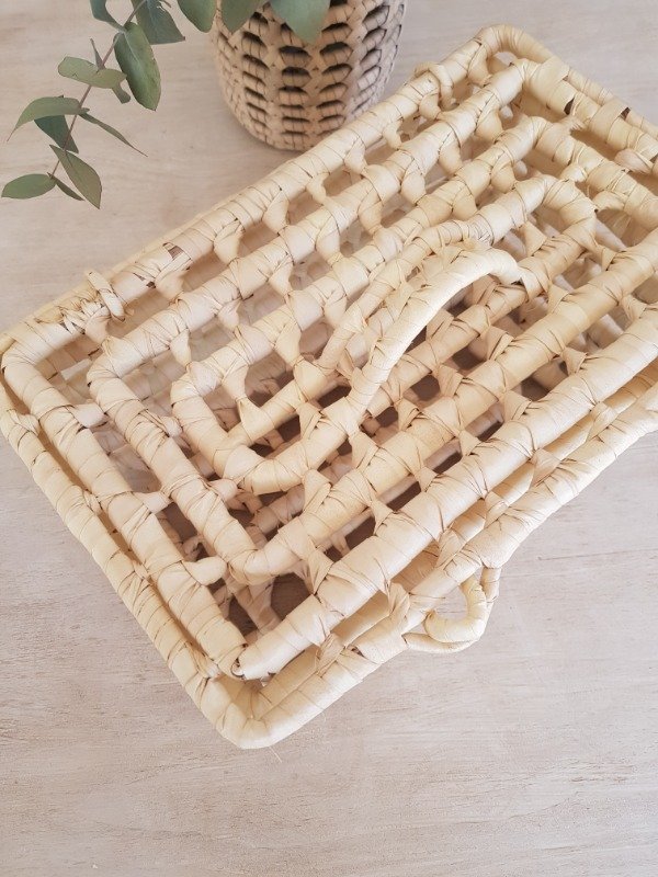 100% palma natural (fibra vegetal). Sin tintes. Cierre frontal.