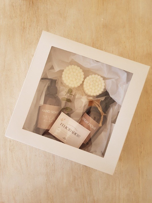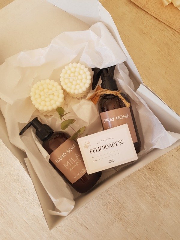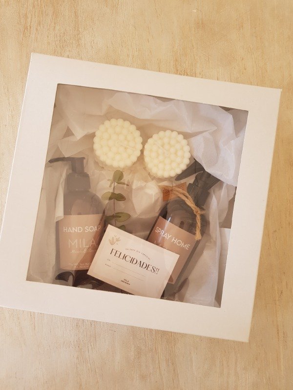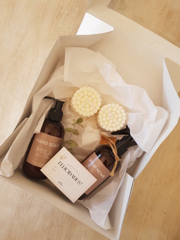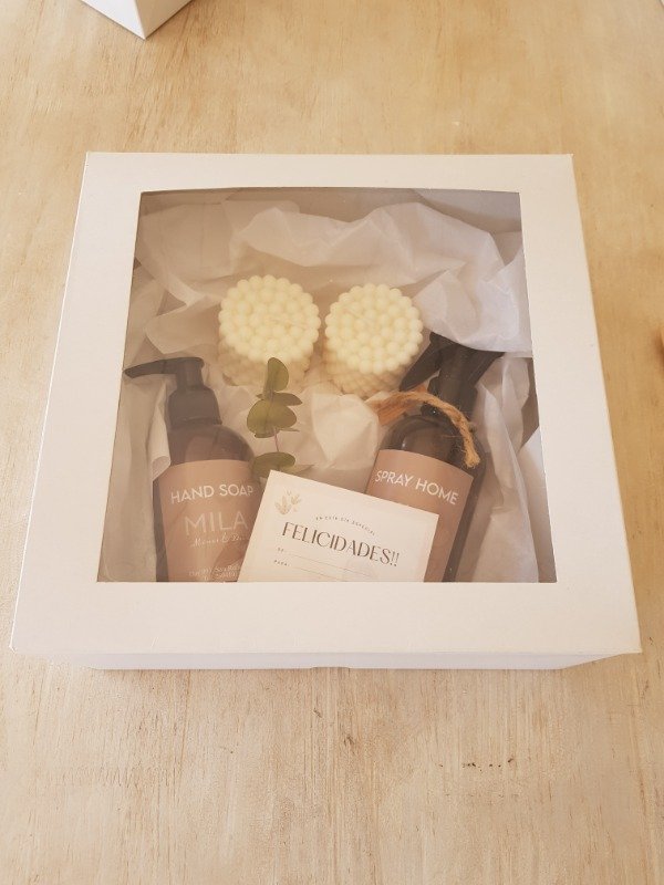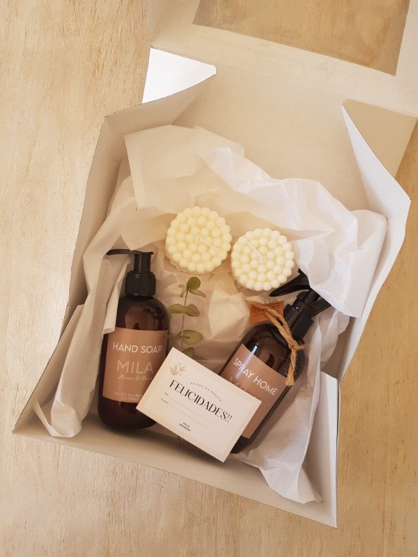 Incluye 2 velones de cera vegetal aromáticos, un spray home para perfumar tus espacios, un jabón líquido y un box con visor, listo para regalar.